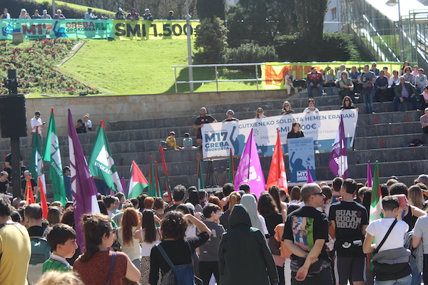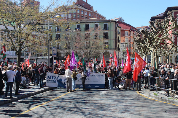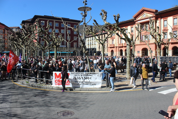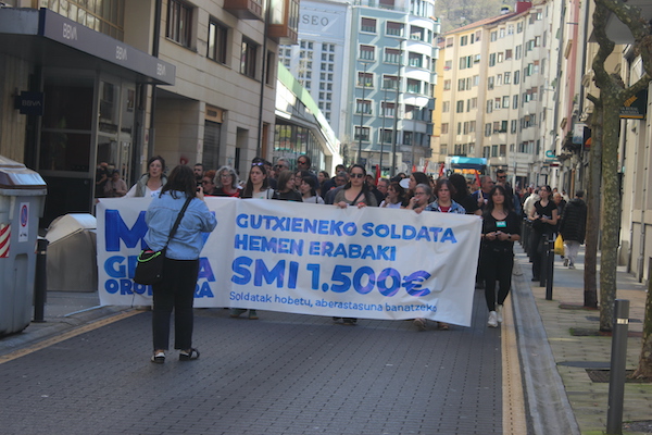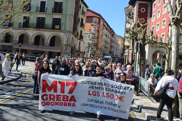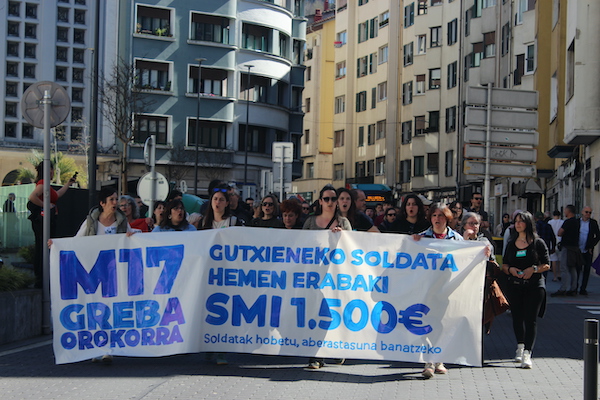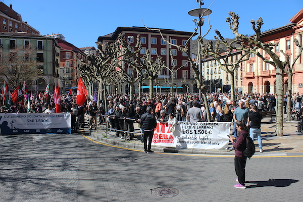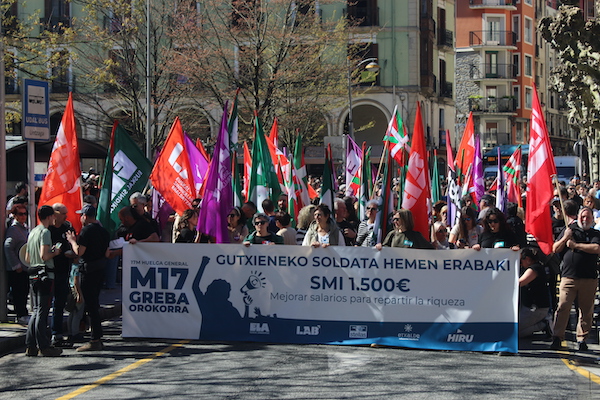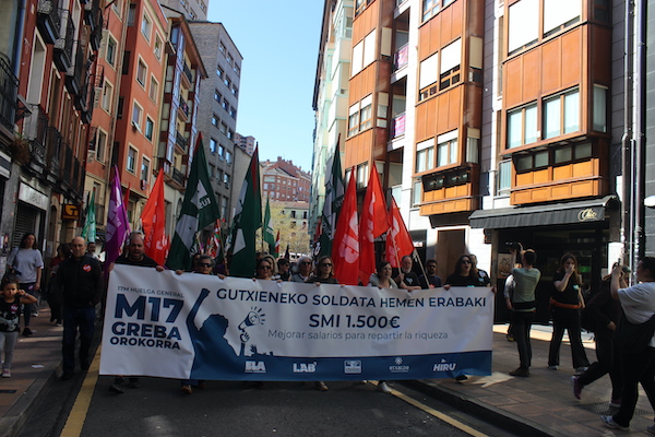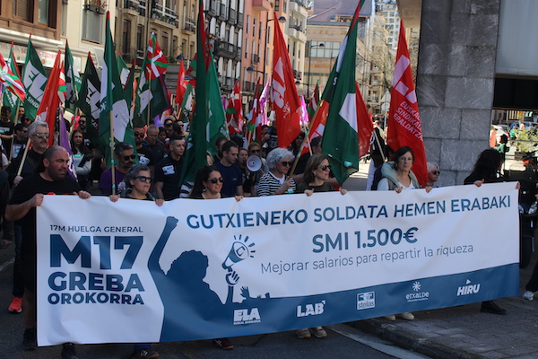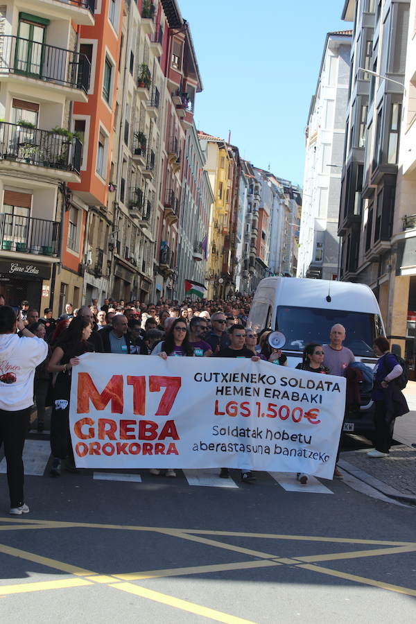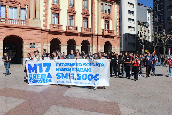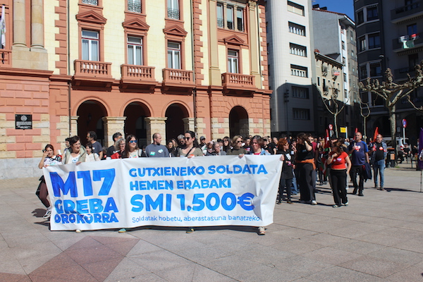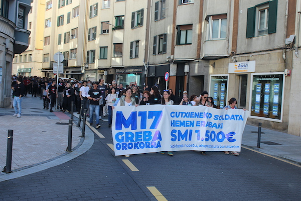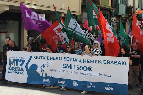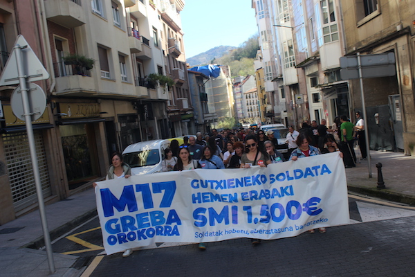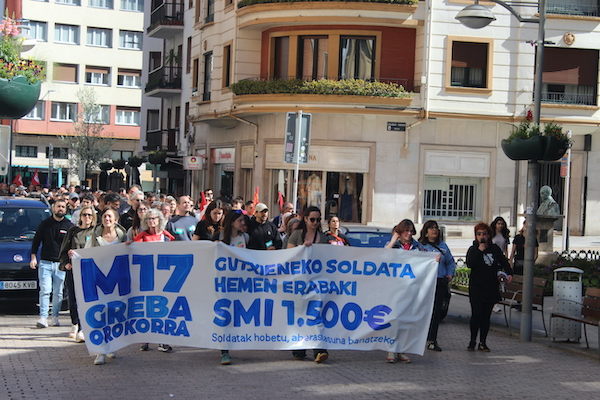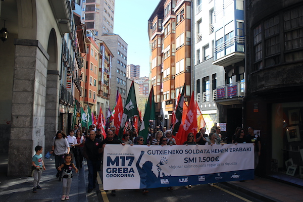 ‘Gutxieneko soldata hemen erabaki. 1.500 euro. Soldatak hobetu aberastasuna banatzeko’ goiburupean sindikatuek gaurko deitutako greba orokorraren jarraipena oso zabala izaten ari da goizean goizetik. Gure herrian bertan, normalean baino askoz ere trafiko gutxiago dago, eta industrialdeetan ez ezik, herriko denda, taberna eta bestelako negozio gehienetan gaur ez dute lanik egin. Eguerdian Eibarren egin den manifestazioak jendetza batu du eta herrian aspaldi ikusi den mobilizazio handiena izan da. Eguerdia baino lehen, bi zutabe abiatu dira Untzagarantz, bata Urkizutik eta bestea Unibertsitate Laboraletik. Zutabe biak Untzagan elkartu eta herriko kaleak zeharkatu dituzte, Untzara ailegatu eta bertako ekitaldiarekin amaitzeko. Arratsalderako beste manifestazio bat dago deituta: 18:30ean irtengo da Untzagatik.