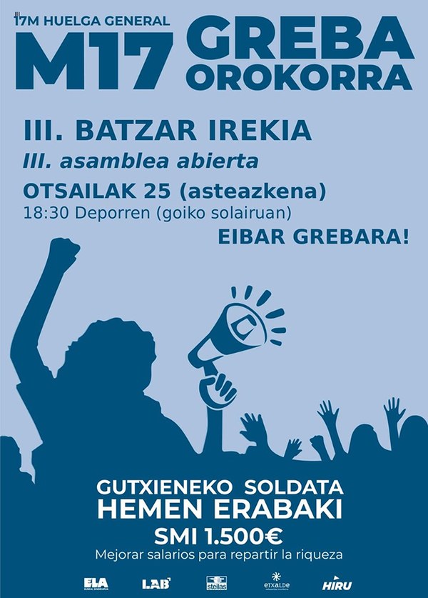 Gutxieneko soldata propioa ezartzeko eta soldatak hobetzeko asmoz, ELAk, LABek, Steilasek, Hiruk eta Etxaldek martxoaren 17rako Hego Euskal Herrian greba orokorra iragarri dute, Gutxieneko soldata hemen erabaki. SMI 1.500 €. Mejorar salarios para repartir la riqueza goiburuarekin, eta bihar (eguaztena, otsailak 25) grebaren lanketan buru belarri jartzeko asmoz, hirugarren batzarra egingo du Eibarko greba batzordeak, 18:30ean Eibarko Klub Deportiboan (1. solairuan). Horren aurretik, arratsaldeko 18:00etan prentsaurrekoa egingo dute Untzagan.