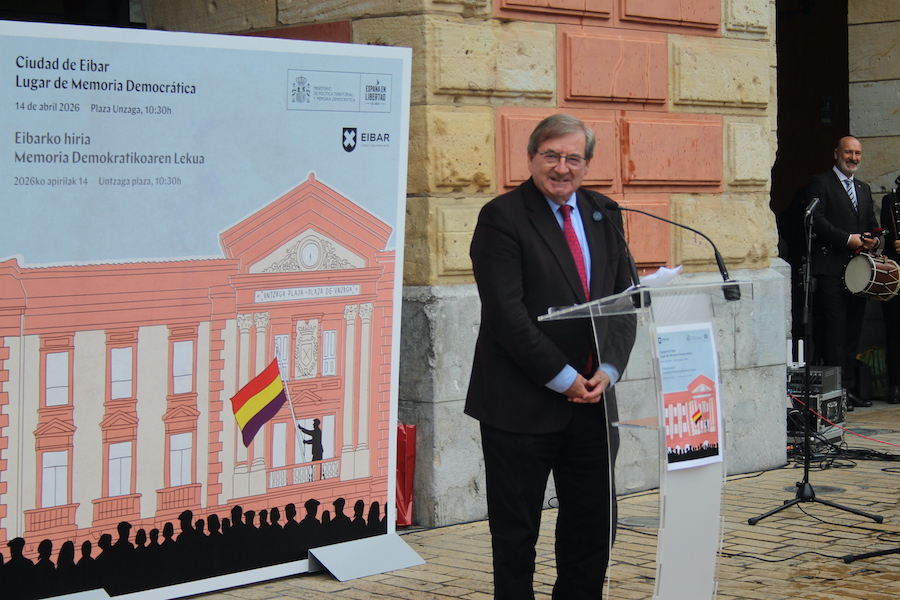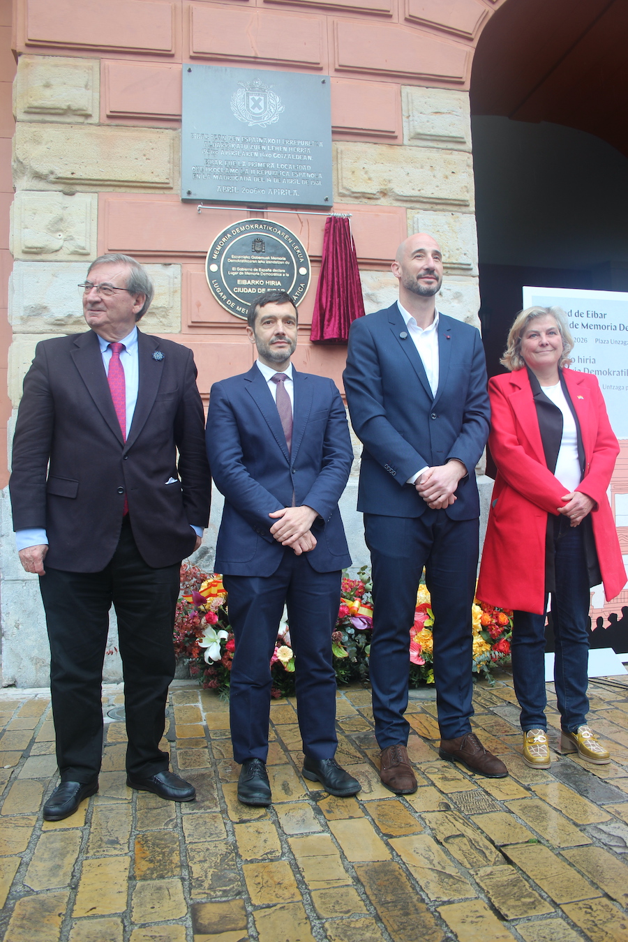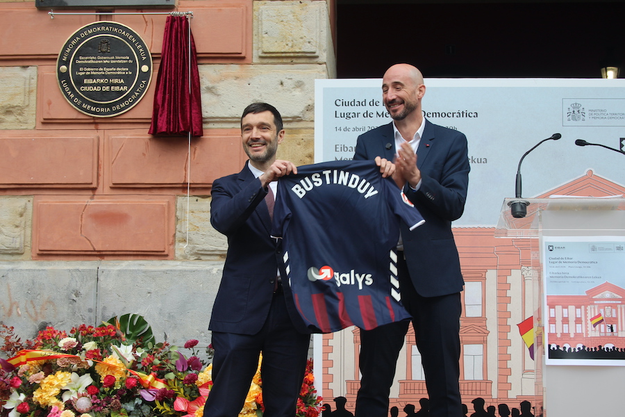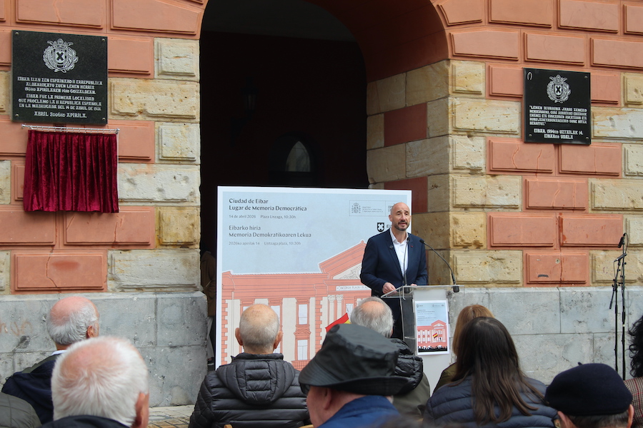 Espainiako Gobernuak eta Eibarko Udalak Eibarko Hiria Memoria Demokratikoaren Leku izendatzen duen oroitzapenezko plaka jarri dute udaletxeko fatxadan, gaur goizean Untzaga plazak hartu duen ekitaldi instituzionalean. Gure herriari egin zaion aitortza hori aurreko astelehenean argitaratu zen Estatuko Aldizkari Ofizialean. Gaurko ekitaldian Espainiako Gobernuko eta Eusko Jaurlaritzako ordezkariek hartu dute parte, Eibarko udal ordezkariekin batera. Horrela, Eibarrekin lotura berezia duen Pablo Bustinduy (1931ko apirilaren 14an Bigarren Errepublika aldarrikatu zenean, Eibarko zinegotzia zen Gregorio Bustinduyren biloba da) Gizarte Eskubide, Kontsumo eta 2030 Agendako ministroa, Fernando Martinez Memoria Demokratikoaren Estatuko idazkaria, Jon Iraola Eibarko alkatea, Marisol Garmendia Espainiako Gobernuko Euskal Herriko ordezkaria eta Arritxu Marañon Eusko Jaurlaritzako Giza Eskubideen, Memoriaren eta Bizikidetzaren Sailburuordea izan dira ekitaldian, beste hainbat agintari, erakunde-ordezkari eta herriko elkarte memorialistarekin batera.