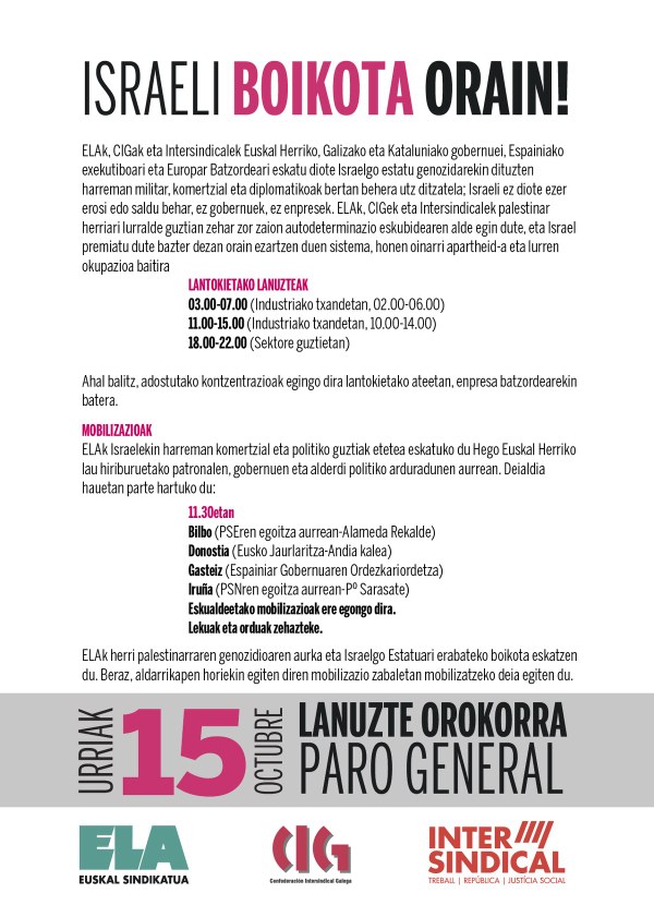 Lanuzte hauek CIG (Galiza) eta Intesindical (Katalunia) sindikatuekin batera deitu ditu ELAk. Herri palestinarraren genozidioa gelditzea eta Israelgo Estatuari erabateko boikota eskatzen dute sindikatutik eta, beste batzuetan bezala, aldarrikapen horiek dituzten mugimendu sozialek deitutako mobilizazioetan parte hartzeko deia egin dute.