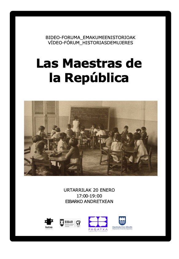 Pagatxa emakume elkartearen eskutik egiten den Emakumeen Istorioak bideo-forumaren saioa egingo da bihar (martitzena, urtarrilak 20), 17:00etatik 19:00etara bitartean Andretxean. Espainiako Bigarren Errepublikako maistrak izango dira protagonista eta, besteak beste, beraiek egindako lanaren garrantziari buruz arituko dira. Horretarako, Pilar Perez Solanok zuzendutako Las maestras de la Republica dokumentala proiektatuko dute eta, ondoren, Patricia Perex Cotok dinamizatuko duen solasaldia egingo da. Betiko moduan sarrera librea izango da, interesa duten guztientzat.