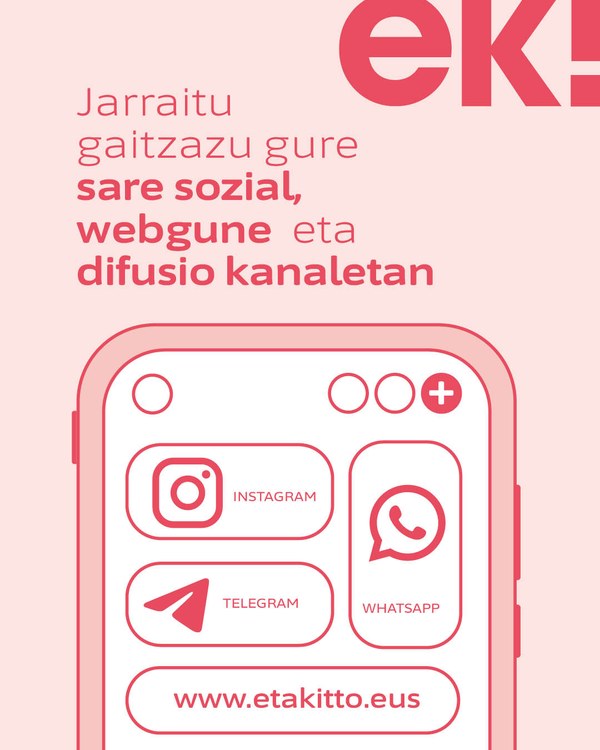 Instagram kontuak du pisu handiena gurean, eta beraz, lanketa berezia egin dugu bertan. Berritasunen artean, izena aldatu diogu kontuari: lehen ‘gaztekitto’ izena zuen kontua ‘etakitto.eus’ da orain. Modu berean, aktualitateko gaiak lantzeko moduak eguneratu ditugu (kale galdeketa gehiago egiten hasi gara, esaterako). Horri lotuta, diseinua ere egungo eduki eta beharretara egokitu dugu, eduki-mota bakoitzerako diseinu propioa sortuz.