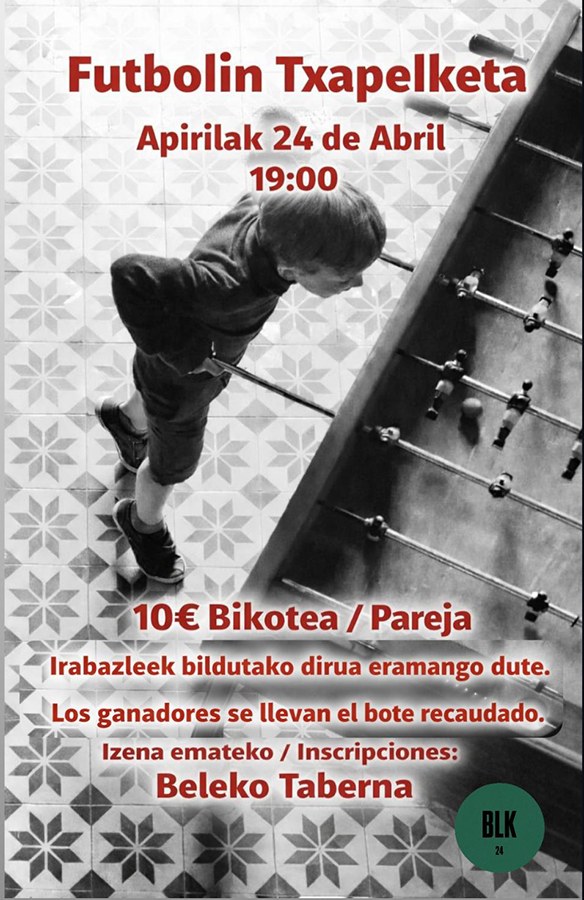 Futbolin txapelketa antolatu dute Beleko tabernakoek gaur arratsalderako (barixakura, apirilak 24). Bikoteka jokatuko da, 19:00etatik aurrera, eta parte hartu nahi dutenek izena eman eta 10 euro ordaindu beharko dituzte (bikote bakoitzak). Bikote txapeldunak izen-ematean bildutako diru guztia eramango du, sari gisa. Izen-ematea tabernan bertan egingo da.