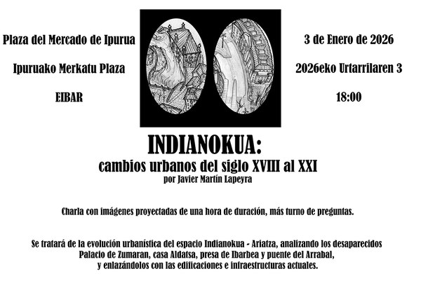 “Indianokua: cambios urbanos del siglo XVIII al XXI” izenburuko hitzaldia emango du Javier Martin Lapeyra eibartarrak urtarrilaren 3an, zapatua, 18:00etan Ipuruako Merkatu Plazan. Ordubete inguruko hitzaldiari laguntzeko proiekzioak erabiliko ditu, eta jendeak galderak egiteko aukera izango du. Hizlariak azaldu duenez, “Indianokua-Ariatza inguruaren eboluzio urbanistikoari buruz arituko naiz eta, besteak beste, gaur egun desagertuta dauden Zumaran jauregia, Aldatsa etxea, Ibarbea presa eta Arrabalgo zubia aztertuko ditut, gaur egungo eraikin eta azpiegiturekin lotura bilatuz”.