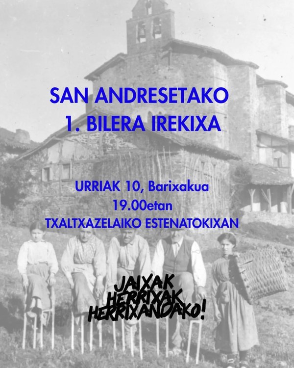 Jaixak Herrixak Herrixandako jai-batzordeak bilera irekia antolatu du barixakurako (urriaren 10erako), aurtengo sanandresak prestatzen hasteko. San Andres jaietara begira egingo den lehen bilera izango da, eta programa osatzen lagundu nahi duten guztiei bertara agertzeko deia egin dute. Txaltxa Zelaiko eszenatokian izango da bilera, 19:00etan.