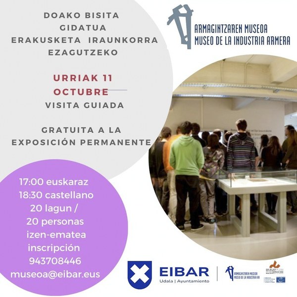 Eibarko Armagintzaren Museoak bisita gidatua antolatu du urriaren 11rako (zapatua), urte osoan ikusgai dagoen erakusketa ezagutu nahi dutenentzat. Azalpenak euskaraz entzun nahi dituztenentzat bisita 17:00etan hasiko da, eta gaztelerazko bisita ondoren, 18:30ean egingo dute. Ordubeteko iraupena izango du, eta dohainik da, baina aldez aurretik izena eman behar da, museoa@eibar.eus helbidera mezua bidalita. Talde bakoitzean 20 lagun onartuko dituzte gehienez, eta onarpena inskripzio-ordenaren arabera egingo da.