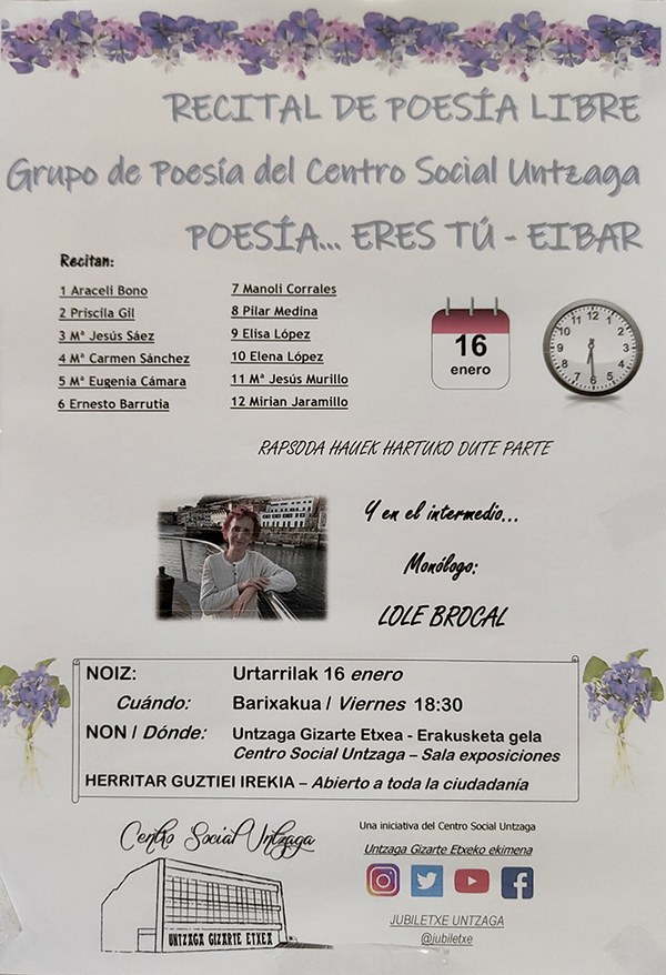 Poesia... eres tu Untzaga gizarte zentroko poesia taldekoek errezitaldi irekia antolatu dute gaurko (barixakua, hilak 16), 18:30ean Untzaga gizarte zentroan (erakusketa aretoan). Herritar guztiei zabalik egingo duten ekitaldian dozena bat lagunek hartuko dute parte, hainbat olerkirekin: Araceli Bono, Priscila Gil, Mª Jesus Saez, Mª Carmen Sanchez, Mª Eugenia Camara, Ernesto Barrutia, Manoli Corrales, Pilar Medina, Elisa Lopez, Elena Lopez, Mª Jesus Murillo eta Miriam Jaramillo, besteak beste. Atsedenaldian, berriz, Lole Brocalek eskainiko duen bakarrizketarekin gozatzeko aukera izango du jendeak. Sarrera librea izango da, nahi duten guztientzat.