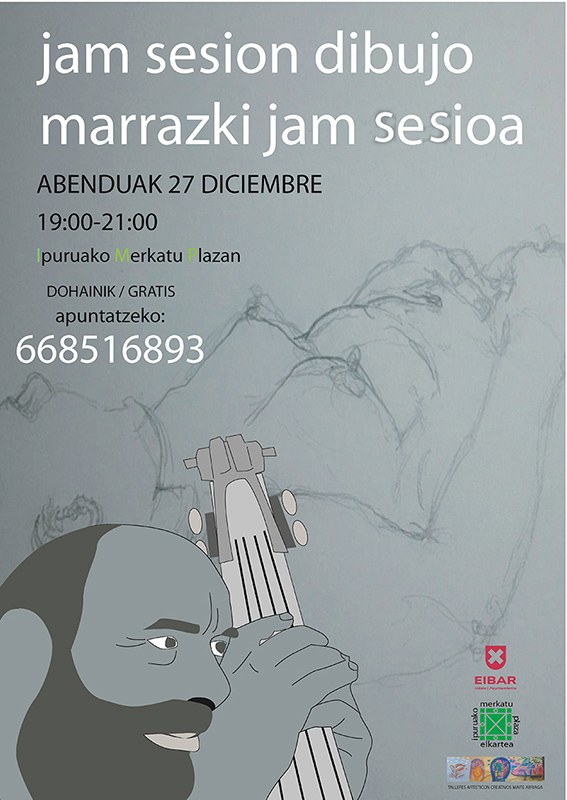 Maite Arriaga artista eibartarrak antolatuta, abenduaren 27an (zapatua) Marrazki Jam Saioa egingo da Ipuruako Merkatu Plazan, 19:00etatik 21:00etara. Horrelako saioetan marrazkilari batzuk elkarrekin biltzen dira, inprobisatzeko, ideiak partekatzeko eta presiorik gabe marrazteko. Honetan, gainera, zuzeneko musika egongo da. Saio honetan Mariano Hurtadoren zuzeneko musika izango dute lagun. Dohainik izango da, baina aurretik izena eman behar da, 668516893 telefono zenbakira deituta.